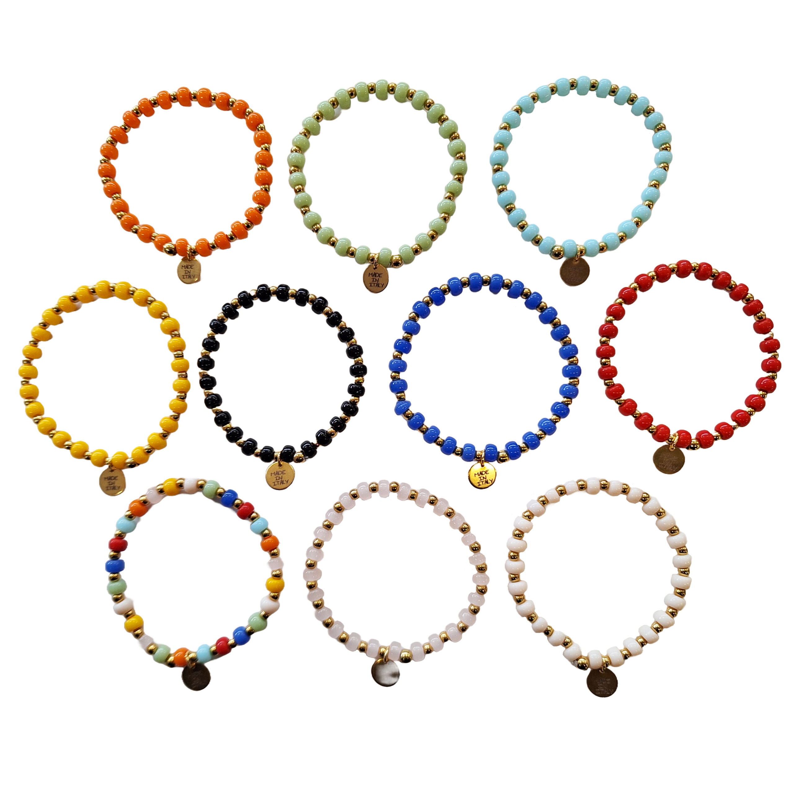 BRACCIALE ELASTICO CON RONDELLE DI VETRO E PALLINE ACCIAIO DORATO 4mm